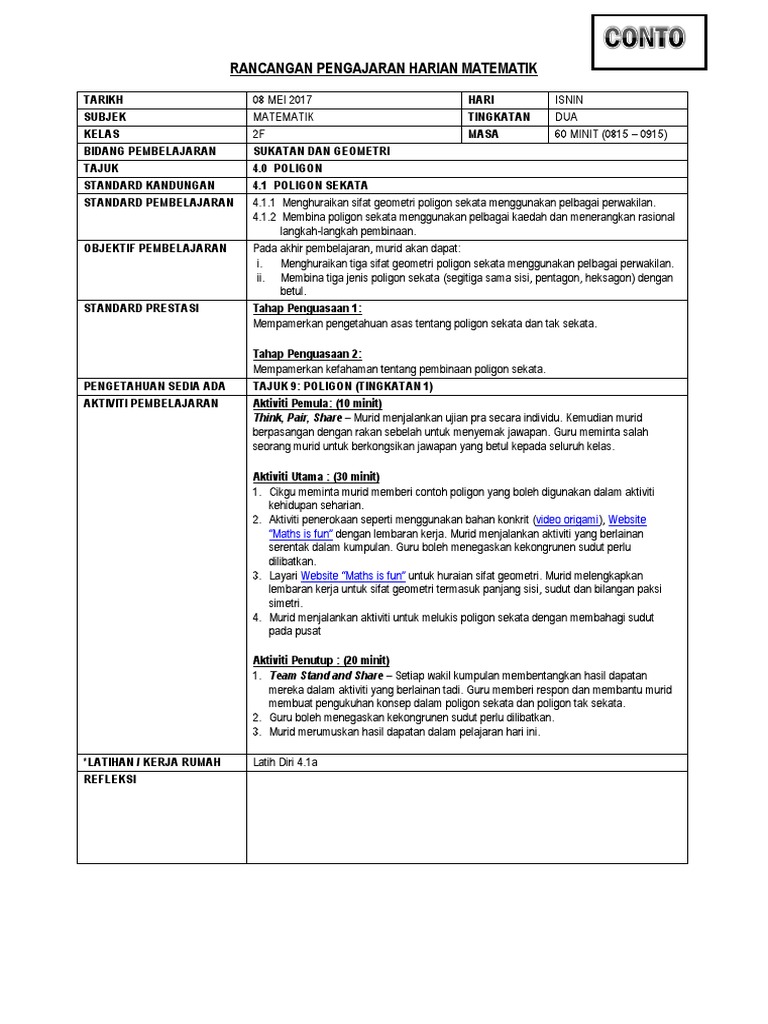 Coontoh Rancangan Pengajaran Harian Matematik Tingkatan 4 Pdf